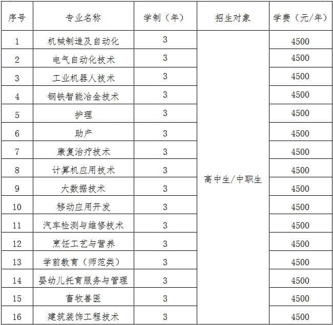 学院设有冶金装备制造、健康护理、信息技术、交通运输、现代服务、工程技术、艺术教育7个二级分院,开设机械制造及自动化、电气自动化技术、工业机器人技术、钢铁智能冶金技术、护理、助产、康复治疗技术、计算机应用技术、大数据技术、移动应用开发、汽车检测与维修技术、烹饪工艺与营养、学前教育(师范类)、婴幼儿托育服务与管理、研学旅行管理与服务、畜牧兽医、宠物医疗技术、建筑装饰工程技术19个专业,现有在校生6800余人。